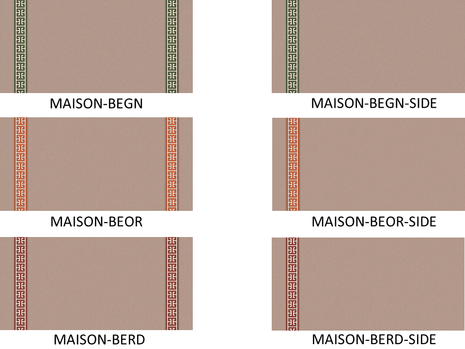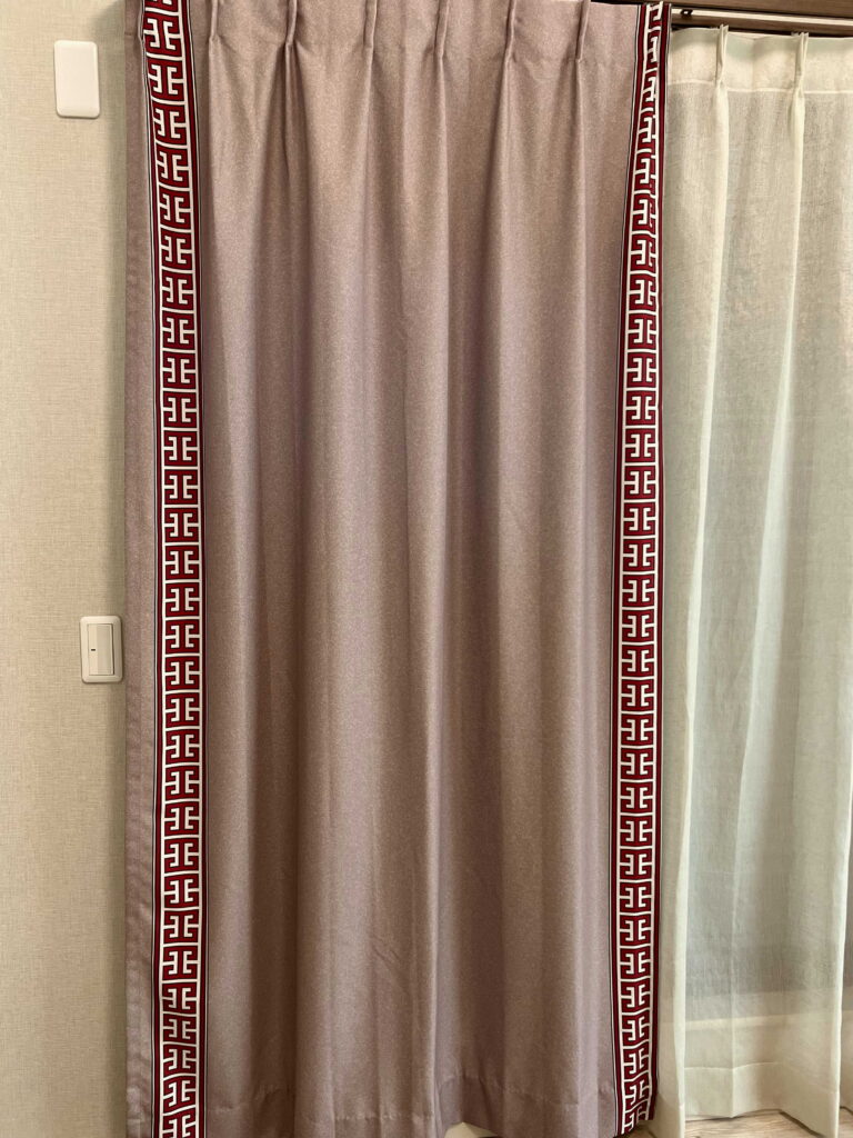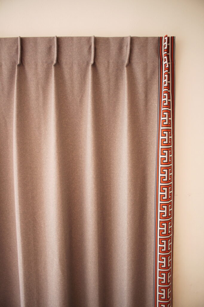 アパレルのハイブランドを思わせる、ラグジュアリーな幾何学柄をテープ状に配置。普通に折り返すと端から5cm内側にテープが入る位置になりますが、カーテンには耳を多めに落して端ぴったりに柄を配置するのもお勧めです。左右用、真ん中用の柄もご用意しています。