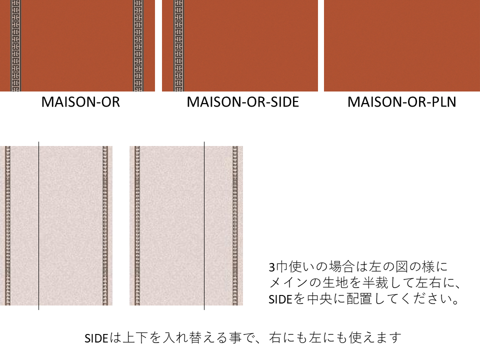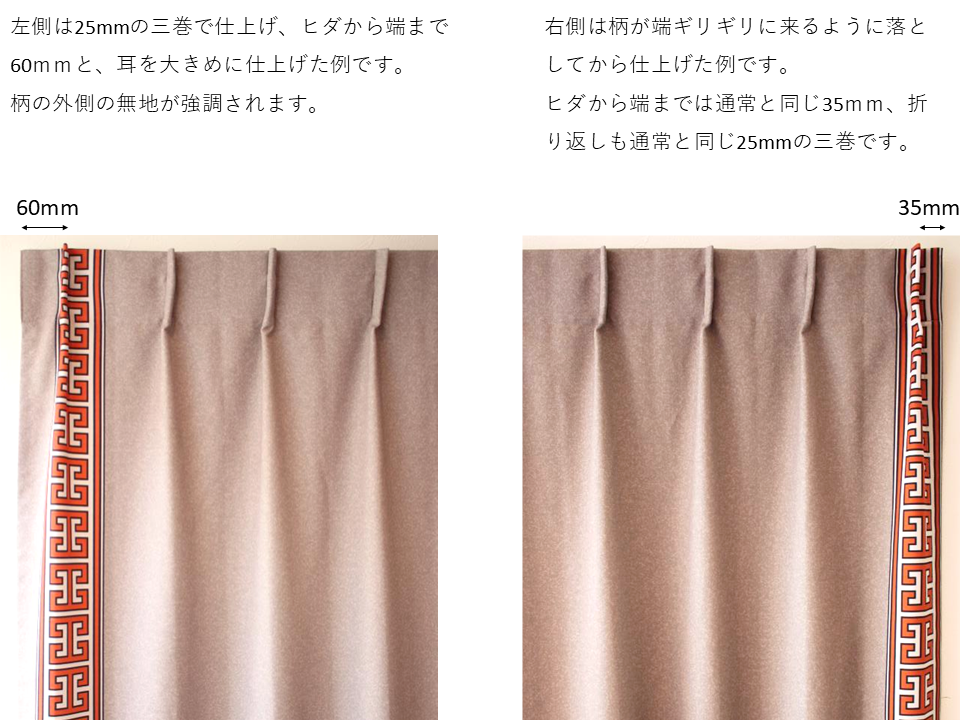 お勧めは、カーテンの場合は右の様に柄を端ギリギリに配置するスタイルで、シェードの場合は左の様に、端に余白を