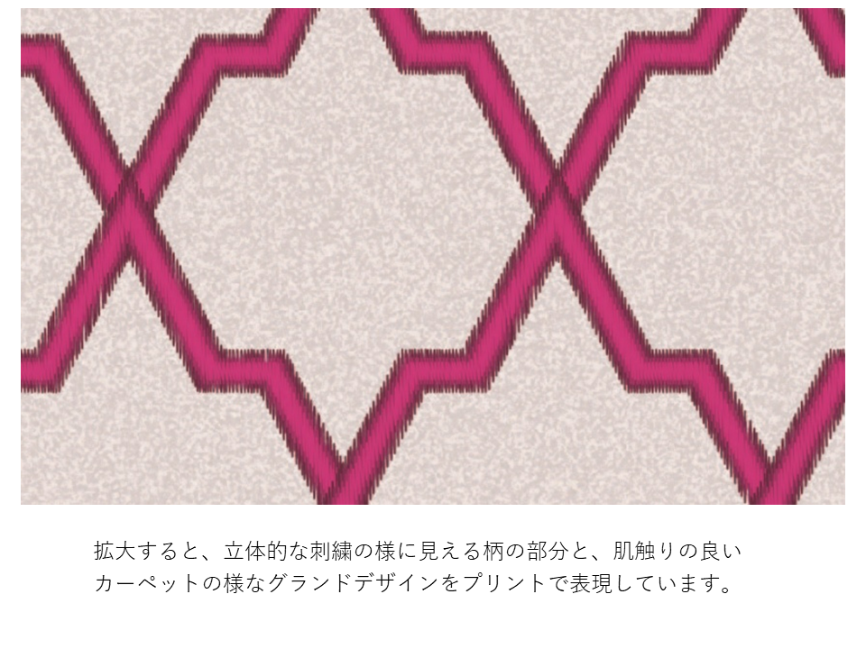 刺繍で柄が施されたかの様な立体感のある幾何学柄が、どこまでも続くデザイン。