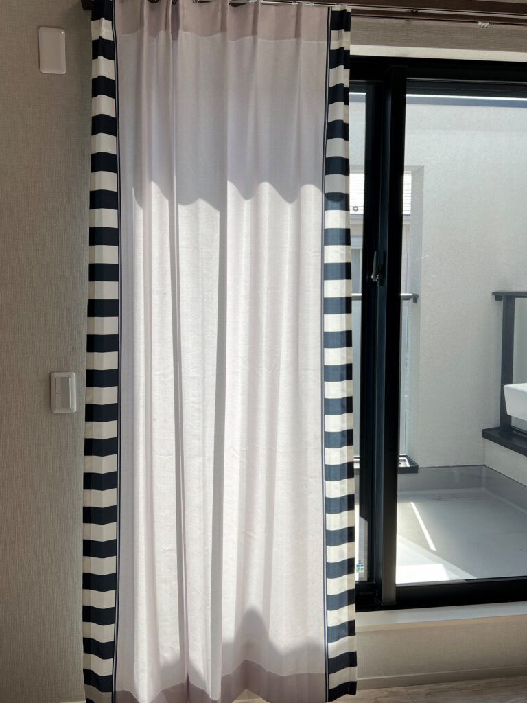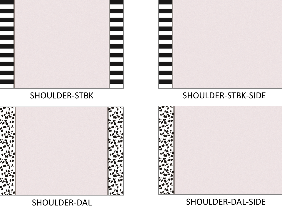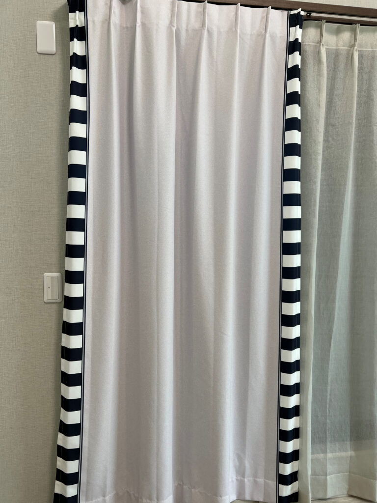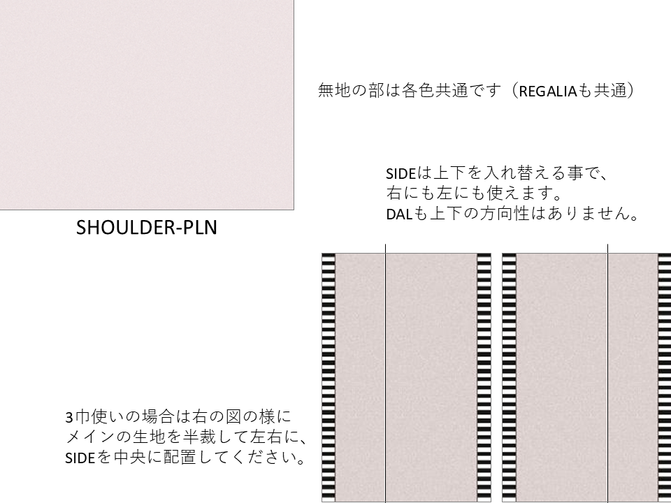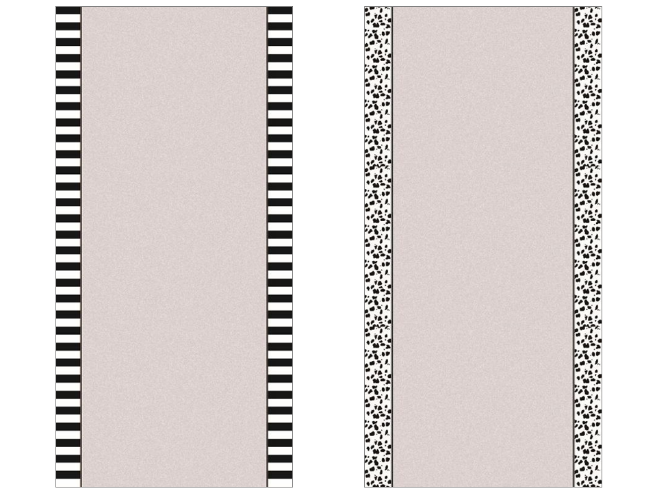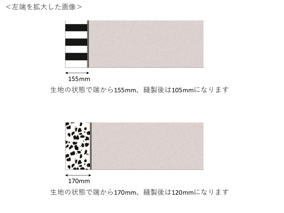 サイドヘムを柄で縁取るデザインで、白黒ストライプとダルメシアン柄の2柄展開。中央の無地部分は共通ですが、柄の巾はそれぞれ少し異なります。左右用、真ん中用もご用意しています。